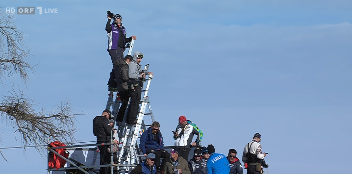 Auf einem Stahlturm tümmeln sich die Coaches, doch für die perfekte Sicht auf der Streif haben sie noch weitere Leitern mitgebracht.