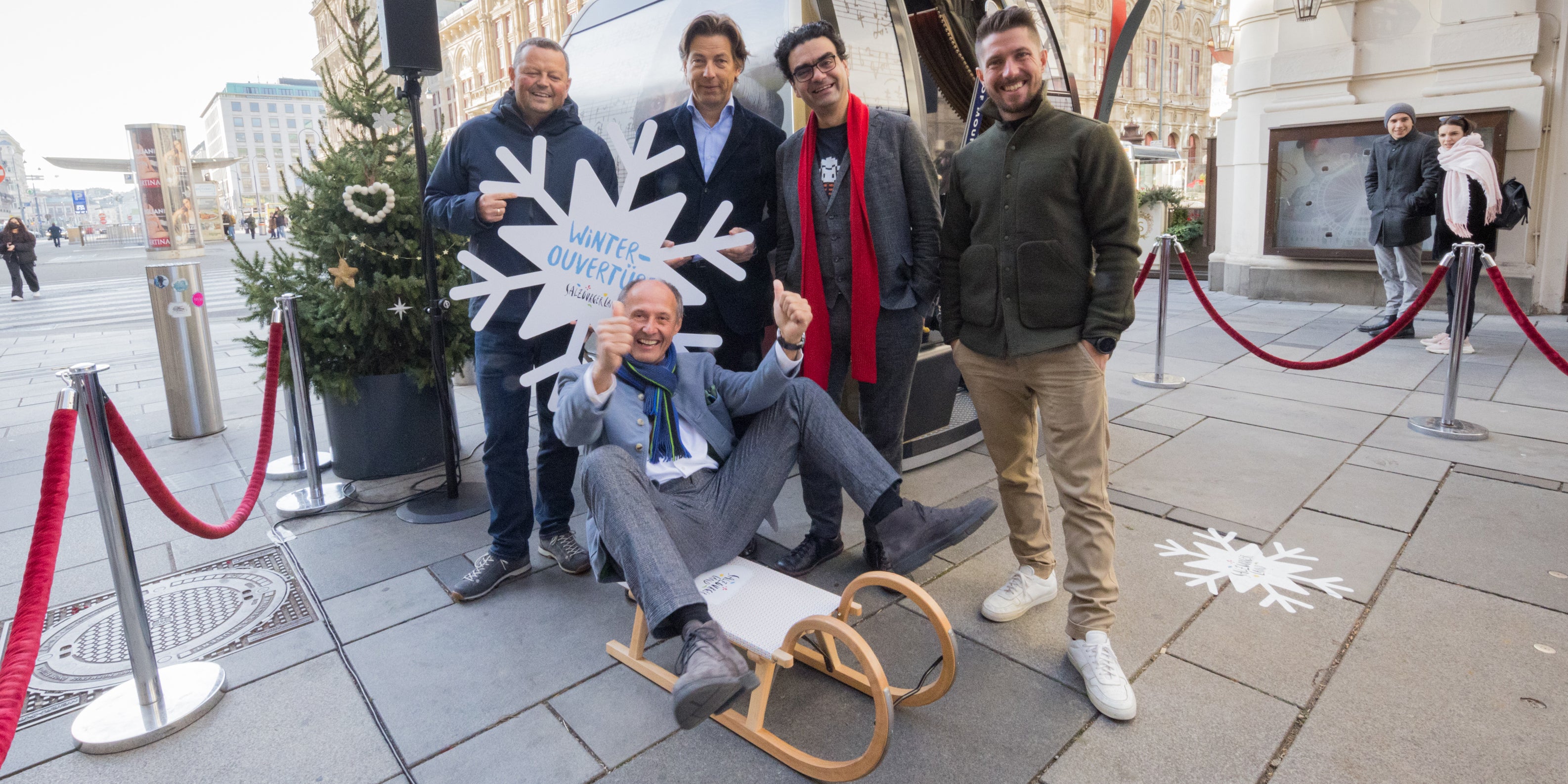 Die Kärntner Straße, Mittwoch Vormittag. Vor dem Hotel Sacher hat die SalzburgerLand-Tourismus eine Gondel der neuen Flying-Mozart-Bahn (Wagrain – Grießenkar) aufgestellt. Mit Hirschers neuem Van-Deer-Ski in der Halterung.