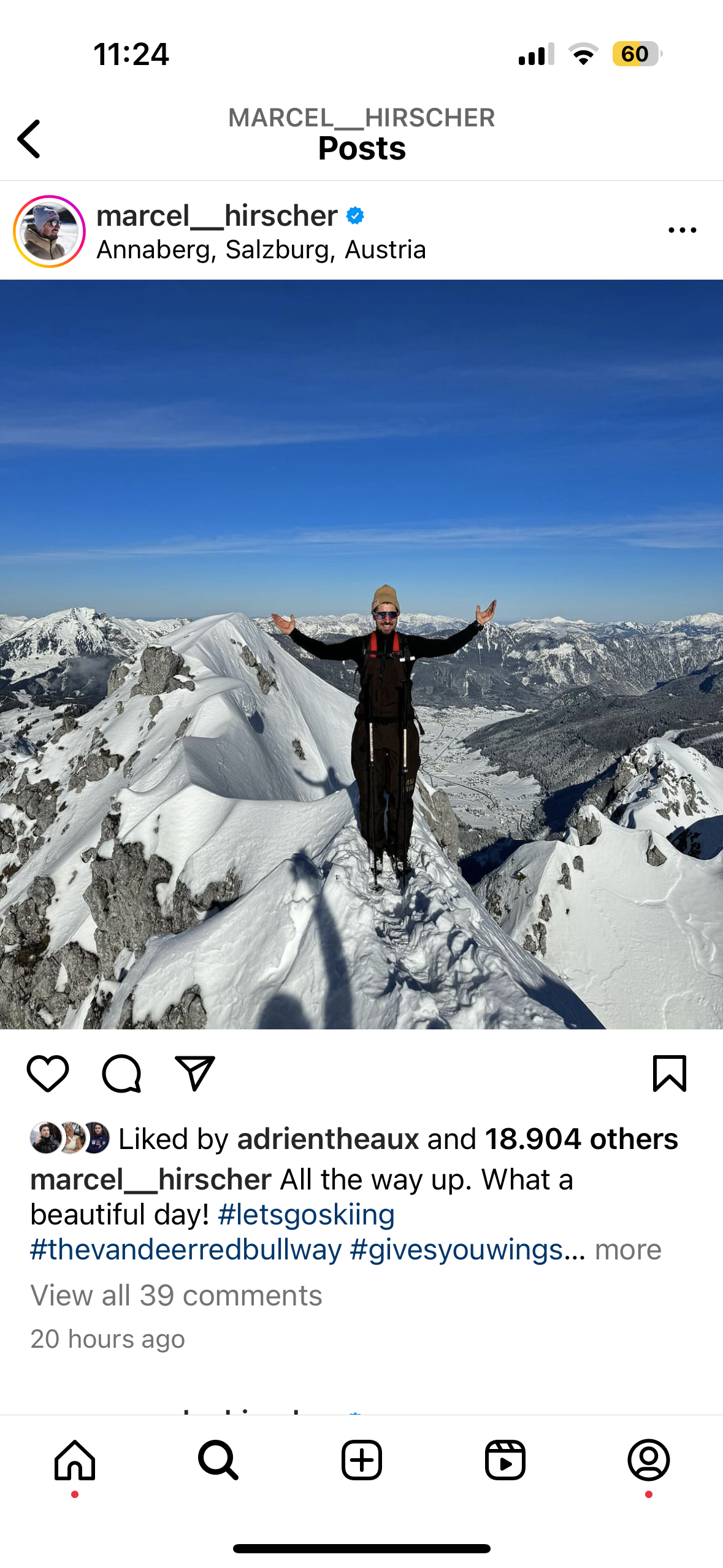 Wir sehen Hirscher im Tourenski-Outfit Mitten in einer prächtigen Salzburger Gipfellandschaft. "All the way up", ist unter dem Foto auf Instagram zu lesen. "What a beautiful day". Ganz oben, an einem wunderschönen Tag ...