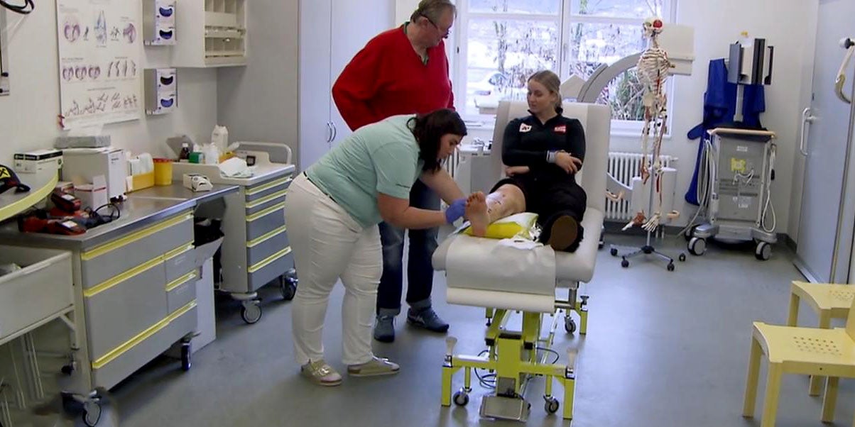 Abtransport im Helikopter, in der Klinik in Schruns wird alles für die Operation vorbereitet. Für Ortlieb ist es bereits die 20. ihrer Karriere. Schenk, der schon Ortliebs Knie nach dem letzten Horrorsturz vor drei Jahren in Crans Montana zusammengeflickt hatte, schildert den Eingriff: „Das Schienbein haben wir, wie man sagt, verplattet, das Wadenbein mussten wir leider offen einrichten und danach verdrahten."