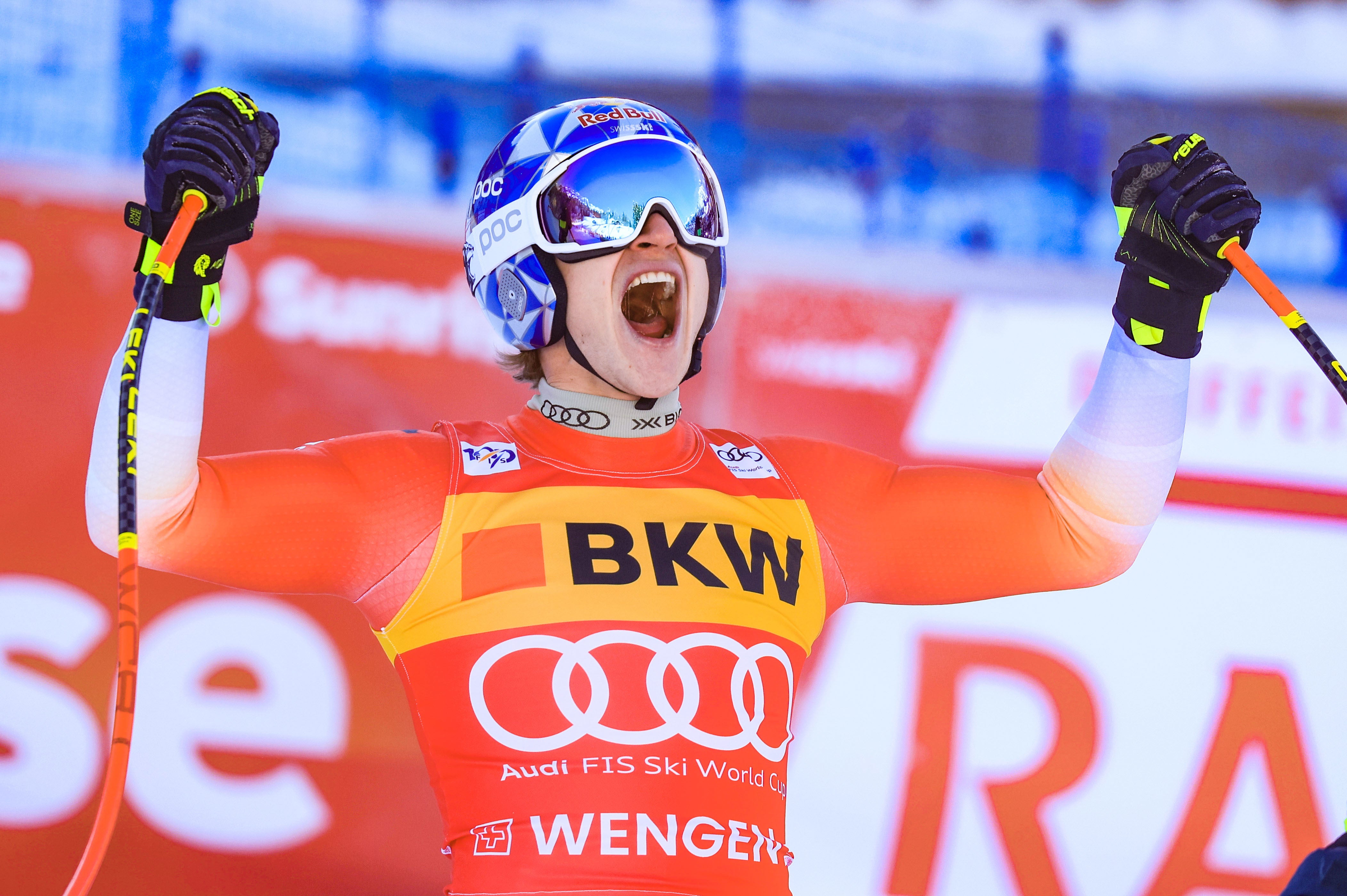 Das Lauberhorn, Donnerstag, 12.46 Uhr. Local Hero Odermatt reißt die Hände in die Höhe und brüllt seine Freude hinaus: "Jaaaaaa!". In 1:43,32 war der Schweizer 8 Zehntel schneller als der zwischenzeitig Führende Aleksander Aamodt Kilde (trotz starker Verkühlung am Podest!), der dann noch vom Trainingsschnellsten Cyprien Sarrazin (2./FRA) auf Platz 3 verdrängt wurde.