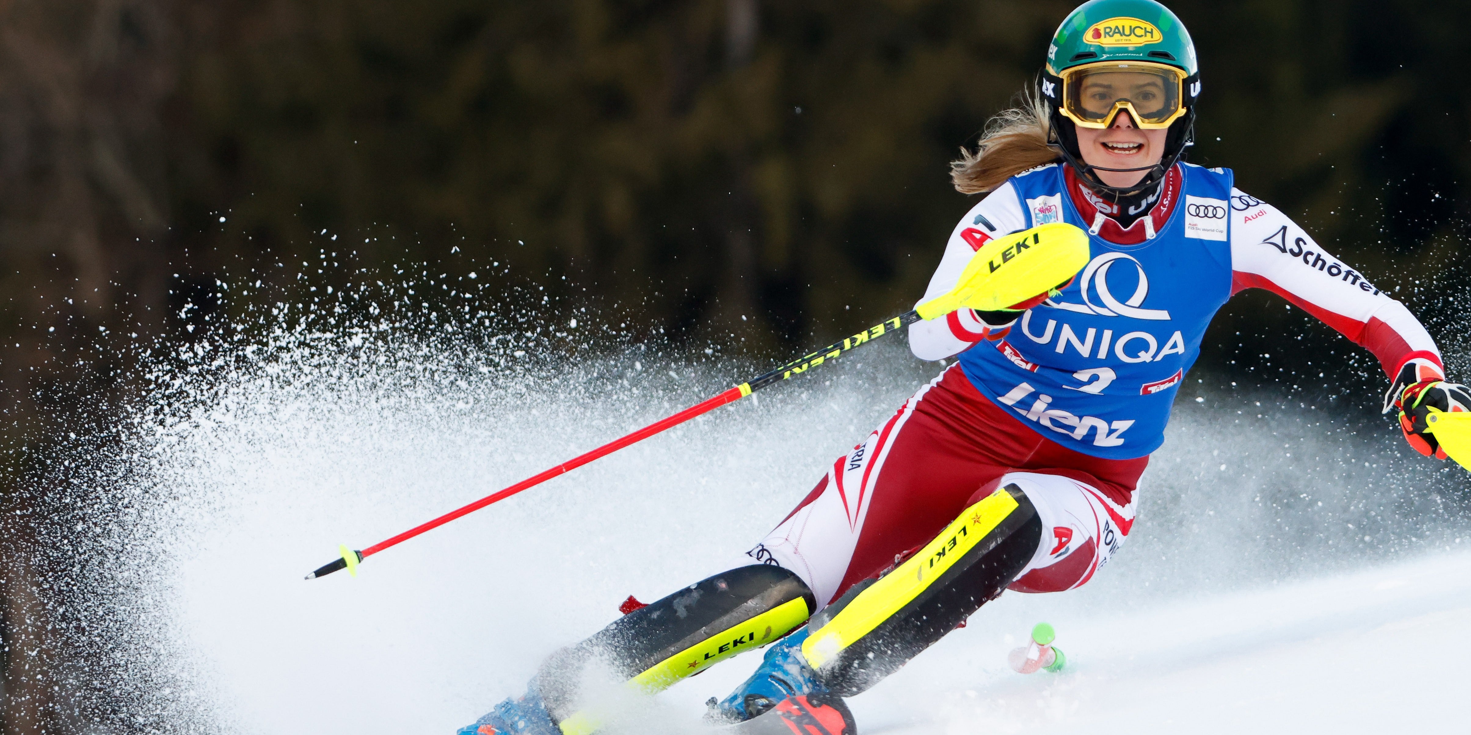 Katharina Liensberger liegt nach dem ersten Slalom-Durchgang in Lienz auf Platz 3 und ist damit voll auf Podestkurs. Vlhova führt vor Gisin.