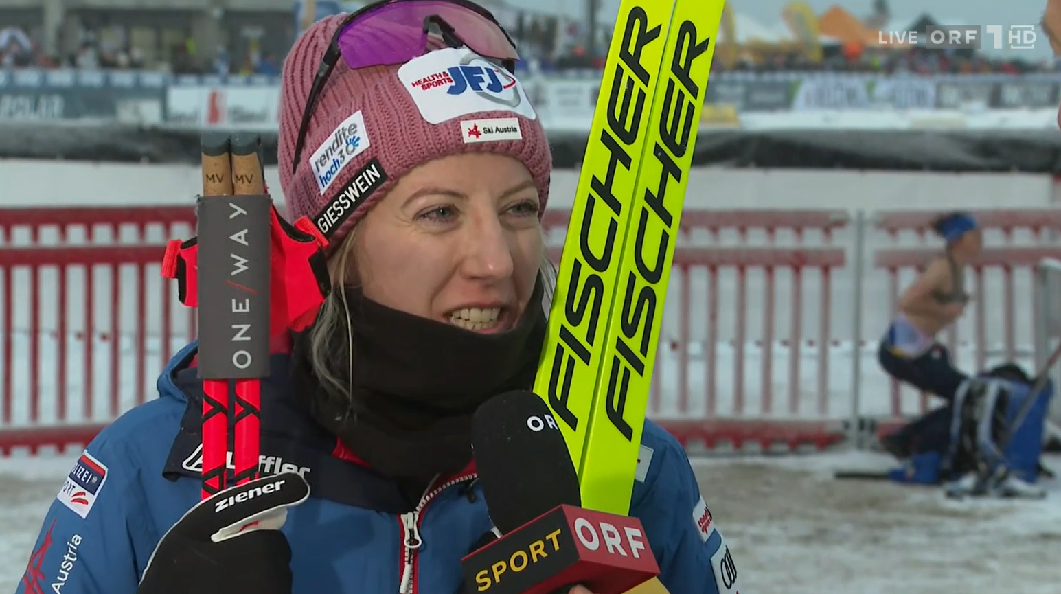 Die Langläuferin hatte offenbar nicht bemerkt, dass Stadlober gerade interviewt und sie somit gefilmt wurde.
