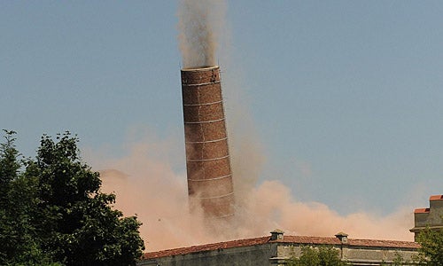 In Schwechat wird ein 48 Meter hoher Rauchfang gesprengt.