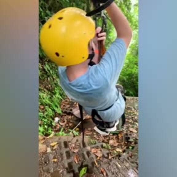 Junge auf Seilrutsche stürzt in kletterndes Faultier