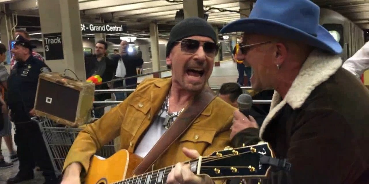 U2 verkleiden sich als Straßenmusiker in einer New Yorker U-Bahn Station.