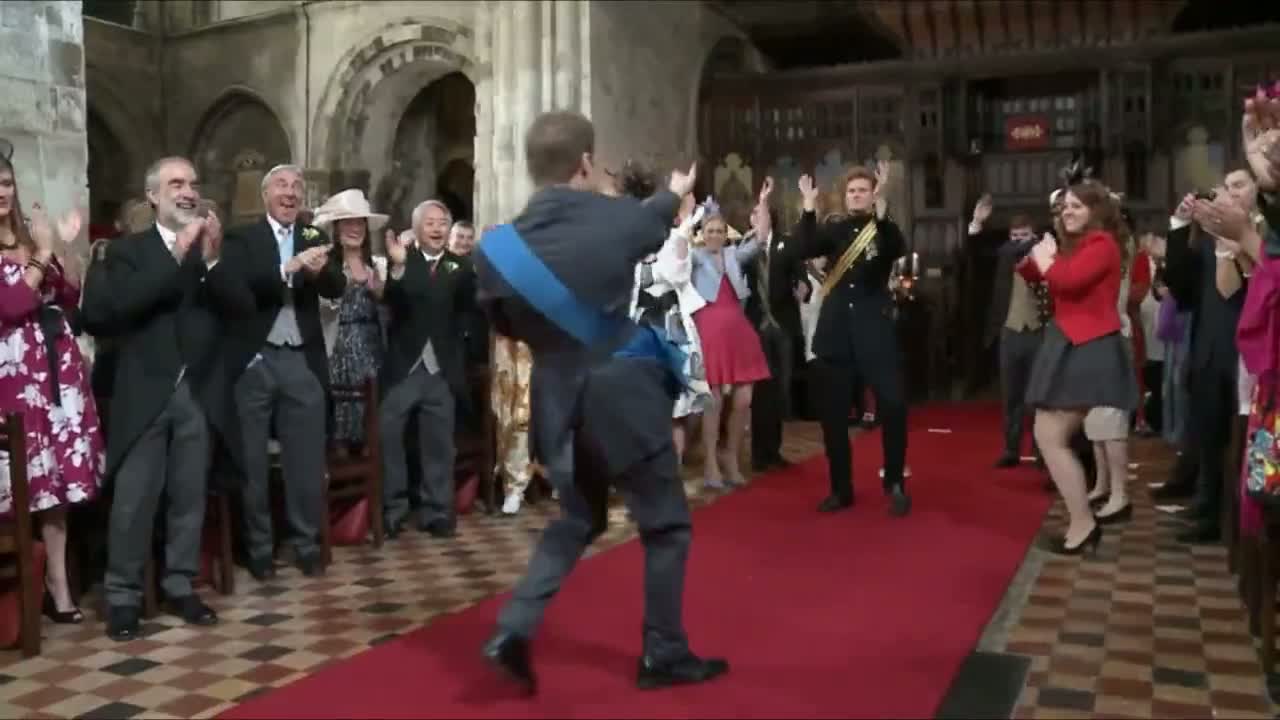 Ein Mobilfunkanbieter hat die königliche Hochzeit bereits jetzt stattfinden und alle Protagonisten tanzend und locker aufmarschieren lassen