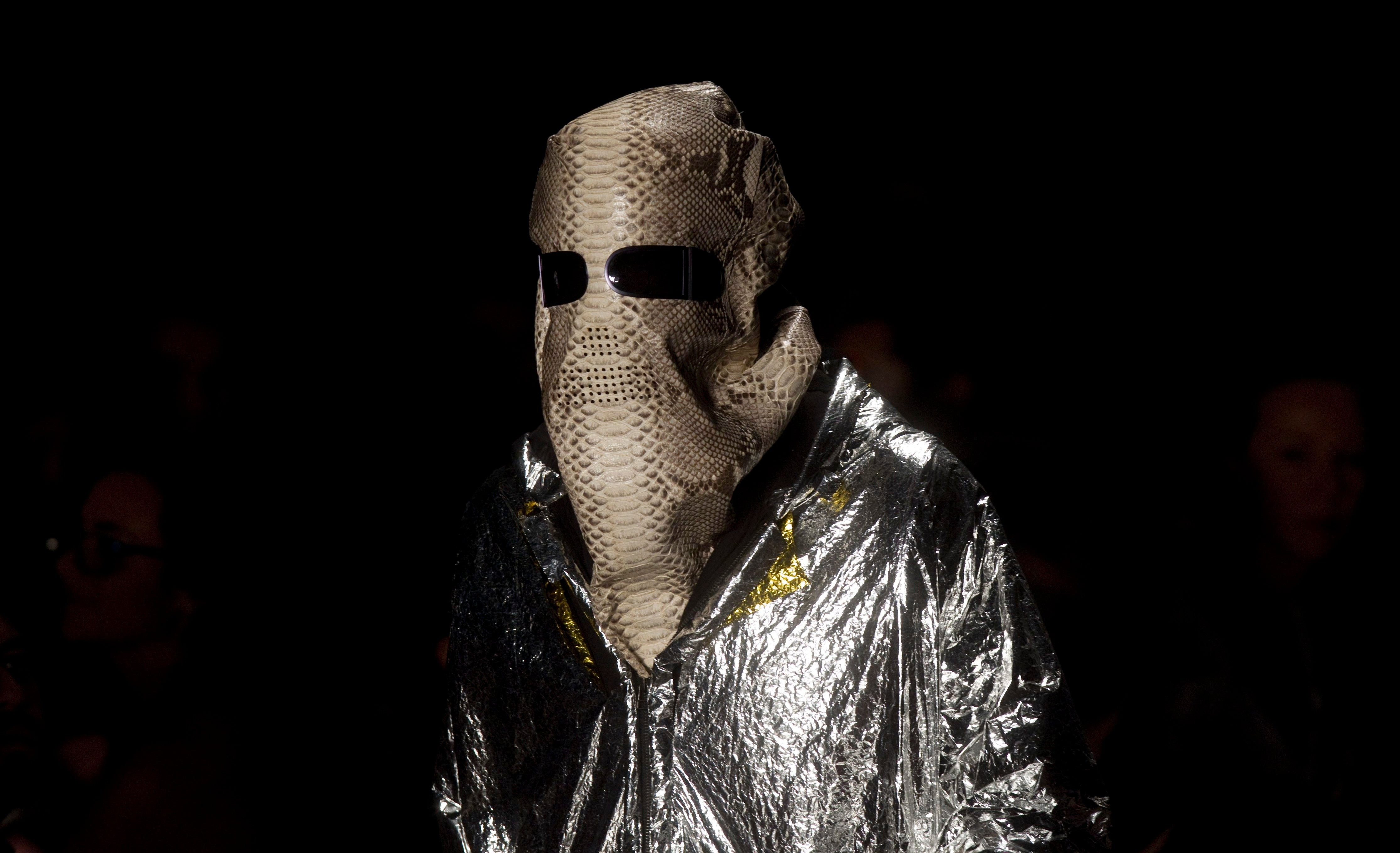 Mit dunklen Gesichtsumhängen und Sonnenbrillen stattete er seine Models aus und kreierte ein gelungenes Star-Wars "Darth Vader" look-a-like Outfit.