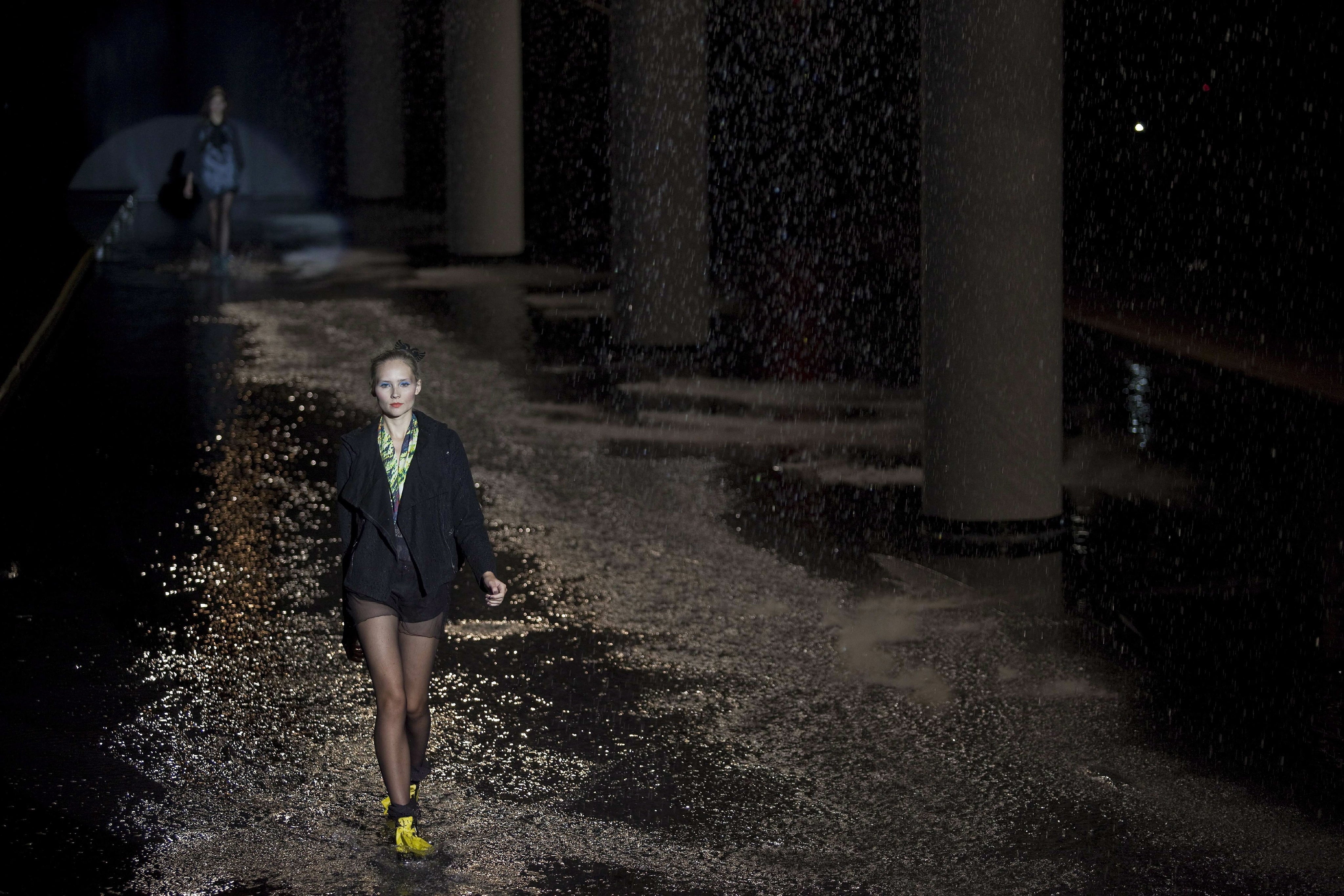 Der ehemalige Drummer der brasilianischen Trash-Metal-Band "Sepultura" Igor Cavalera lässt seine Models zu Marschmusik im Regen durch knöchelhohes Wasser defilieren.