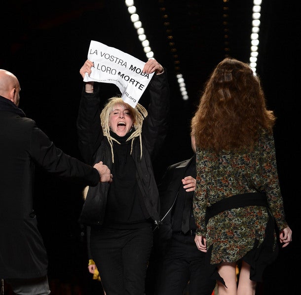 Bei der Cavalli Show in Mailand stürmte eine Protestlerin auf den Laufsteg und musste von den Securitys abgeführt werden. (Quelle: MinWashingtonNews Youtube)
