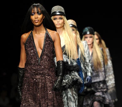 Als eine der letzten großen Schauen der Milan Fashion Week, die heute zu Ende geht, zeigte Cavalli gestern nachmittag seine Kreationen.Als bei der Vorführung der Abendkleider Naomi Campbell unter den Models ist, geht ein Raunen durch die Menge.