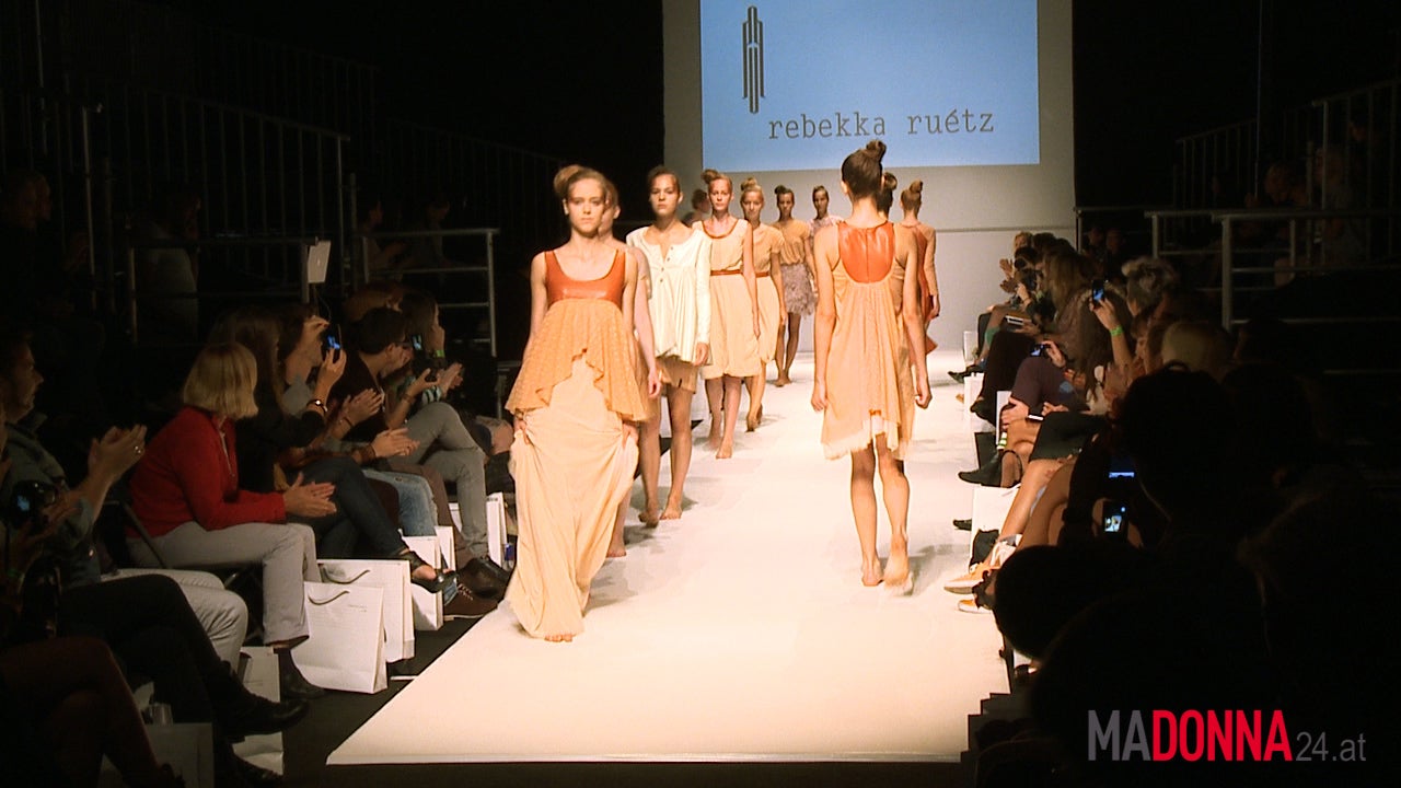 In den Entwürfen von Rebekka Ruetz schlägt sie eine Brücke zwischen dem Sichtbaren, der Mode und dem Unsichtbaren, nämlich Chakren, die an der Innenseite befestigt sind und die Lebensenergie fließen lassen sollen.