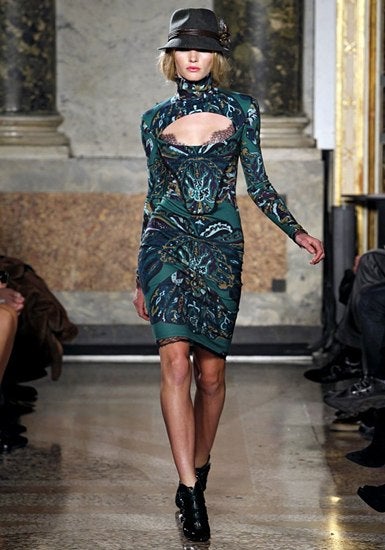 Peter Dundas Show eröffnete ein Look aus Jäger-Hut und Stretchkleid mit den für Pucci typischen Prints. Ein Signal, denn Tiroler Trachten, Sissi-Elemente, Jäger-Couture sowie der Schmuck von Victoire de Castellane zählten zu den Inspirationsquellen des Designers.