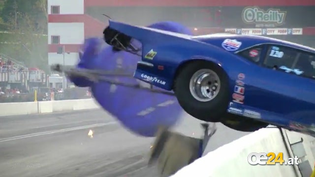 Spektakulärer Unfall: Mit rund 250 km/h rauscht die Drag-Racing-Fahrerin Lizzy Musi in ihrem Rennauto über eine Absperrmauer. Genau dort steht ein Kameramann, der mit einem Sprung in letzter Sekunde sein Leben rettet.