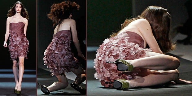 Die Designer stecken die Models in immer höhere Absätze und immer schrägere Schuhformen. Da kommt es natürlich zu Unfällen.