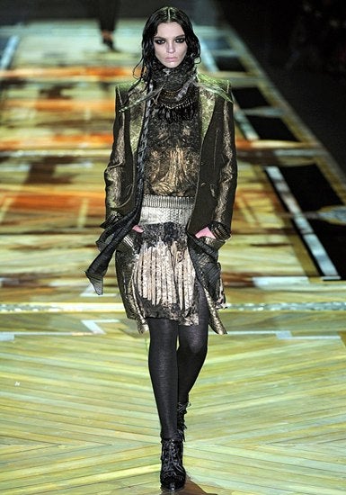 Wenn es Roberto Cavalli bei seiner Kollektion um die Zukunft ging, dann ließe sich diese am besten in einem seiner düsteren Bohemian-Styles beschreiten. Warum auch nicht: Dunkles Gold, Bordeaux und Metallfarben sorgten für eine kantige Farbpalette.