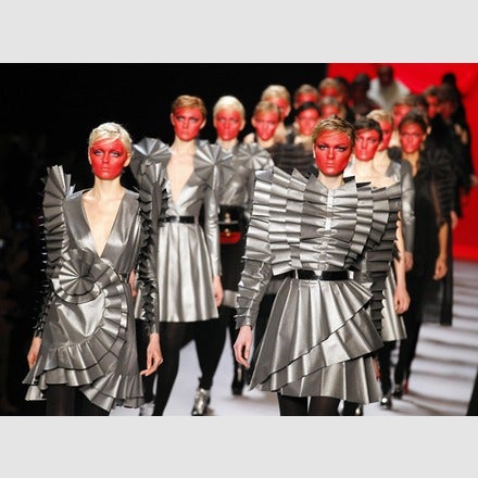 Diesmal zeigten Viktor & Rolf ihre modische Interpretation von Origami - inspiriert von mittelalterlichen Kreuzrittern. Mit rot geschminkten Gesichtern traten die Models nacheinander auf den Laufsteg.