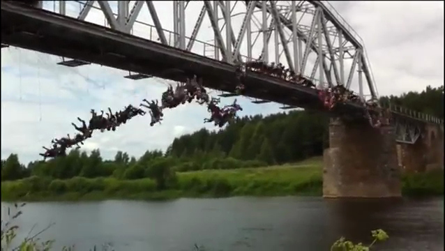 Bei einem Massen-Bungee-Jump in Russland stürzen sich gleich 135 waghalsige Extremsportler von einer Eisenbahnbrücke.