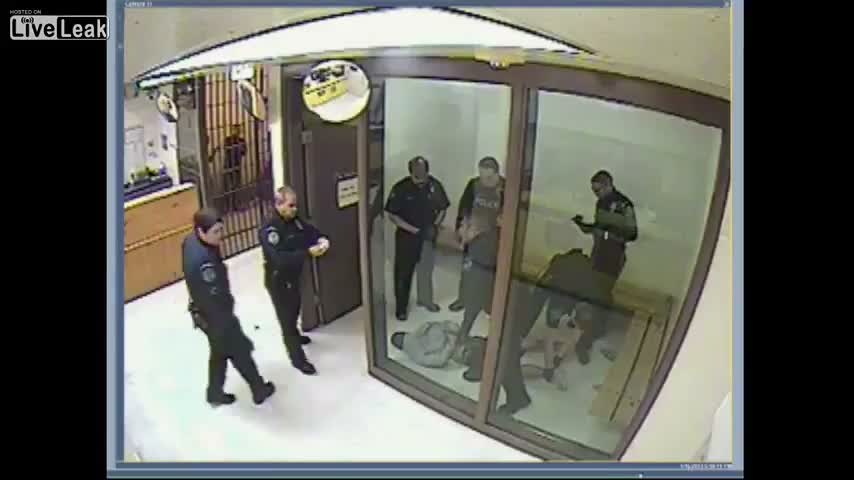 Als die Polizisten einen kürzlich Festgenommenen in die Zelle führen wollen, rastet dieser komplett aus. Wild um sich schlagend geht er gleich auf mehrere Polizisten los. Zu fünf schaffen sie es dann endlich den Aufmüpfigen zu bändigen.