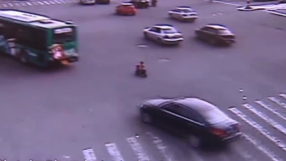 Ein dreijähriger Junge sorgt derzeit in China für Aufsehen: Eine Überwachungskamera zeigt ihn, wie er mit einem Spielzeug-Motorrad mitten auf einer stark befahrenen Kreuzung unterwegs ist.
