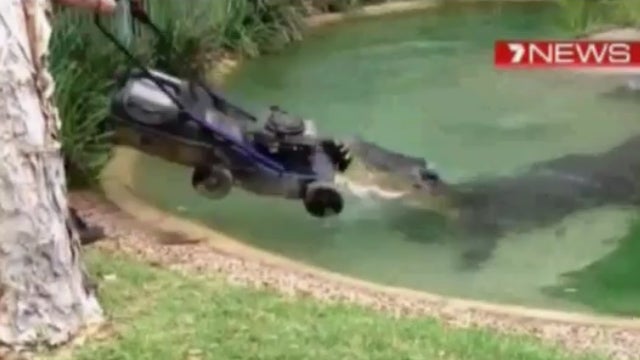 Beim Kampf Mann gegen Krokodil um einen Rasenmäher hat Monster-Reptil "Elvis" in Australien zunächst gewonnen. Das 500-Kilogramm-Tier in den besten Jahren schnappte nach dem Gerät mit laufendem Motor, als ein Wärter die Umgebung seines Beckens in einem Reptilienpark mähen wollte.