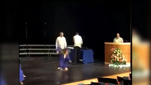 Rachel Michelle hat ihre Urkunde in der Tasche und führt einen Freudentanz auf. Doch hat sie nicht mit dem rutschigen Parkett gerechnet und liegt ein paar Sekunden nach ihrer Auszeichnung auf der Nase.