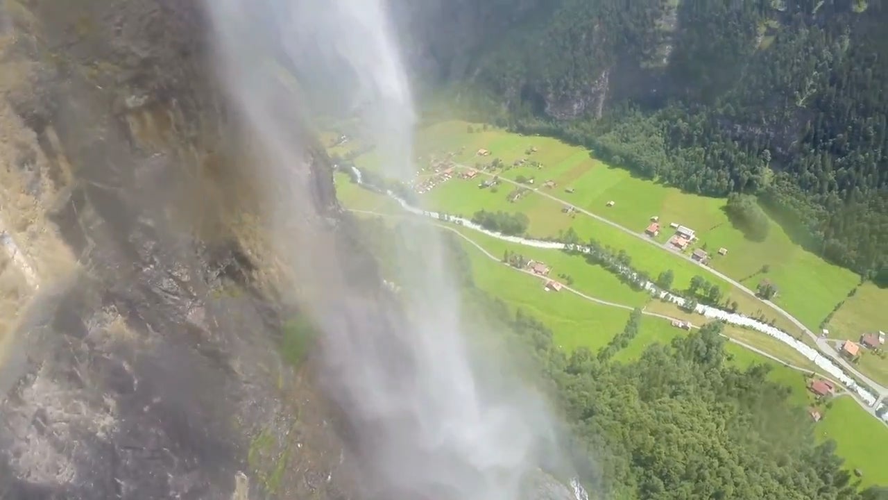 Dieser Wingsuitsprung endet mit einer kalten, erfrischenden Dusche.