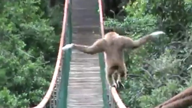 Warum einfach wenn es auch schwer geht? Dieser Affe balanciert über den Handlauf einer Brücke.