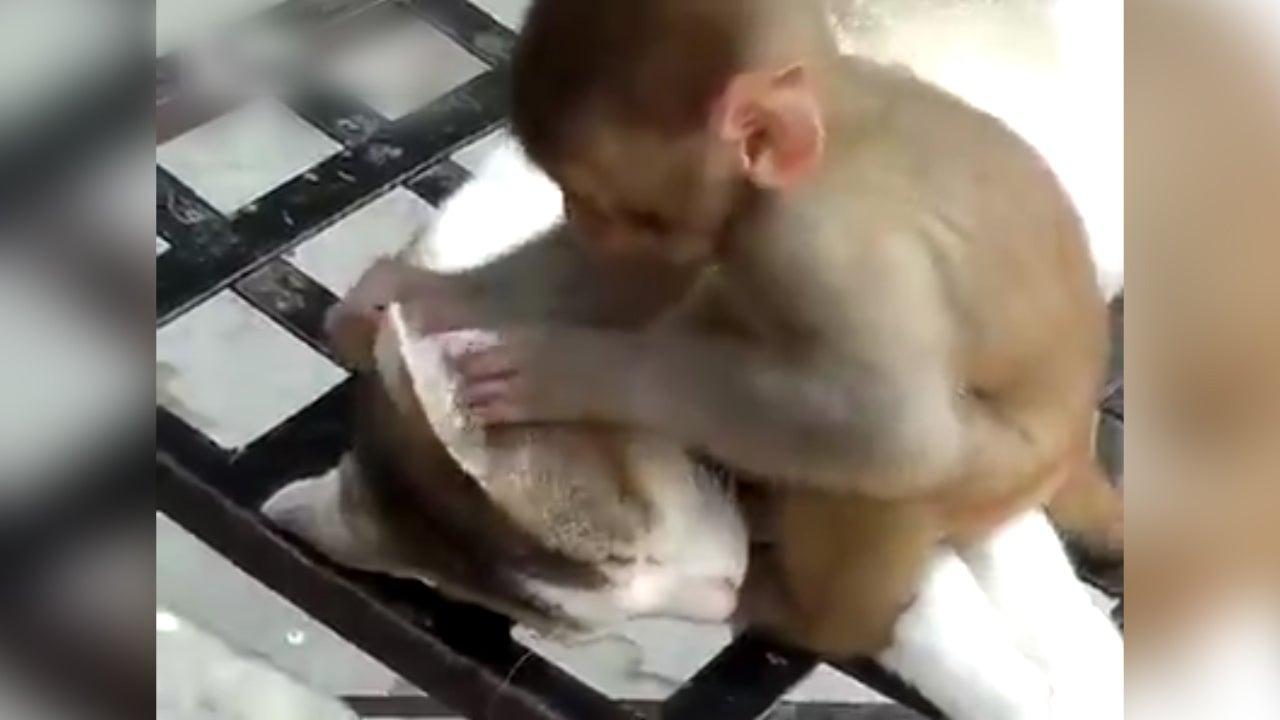 Katze versucht zu schlafen, wird aber ständig von lästigem Affen genervt.