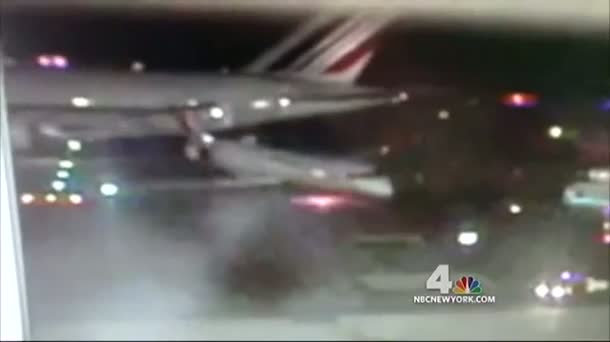 Während der Air France Flug 7 F-HPJD zum Stillstand rollte, übersah er ein kleineres Flugzeug der Comair und kappte ihm das Hinterteil ab. (Quelle: NBC)