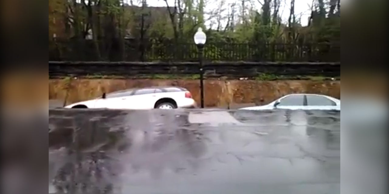 Nach starken Regenfällen stürzt die Straße in Baltimore ab, reißt Autos acht Meter in die Tiefe.