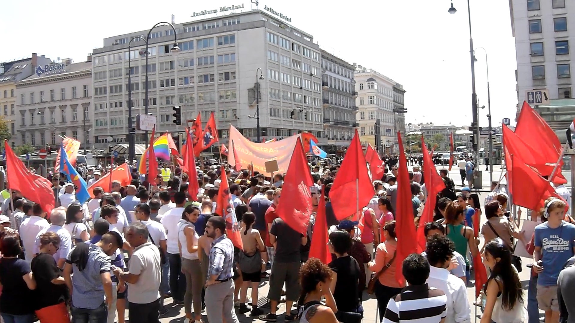 Erdogans Politik spaltet die Türken-Community. Nur wenige Hundert Meter entfernt von der Pro-Erdogan-Demo protestieren Erdogan-Gegner. Es sind weit weniger, höchstens 1.500, aber genauso überzeugt: „Überall Taksim, überall Widerstand“, rufen sie in die Hitze.
