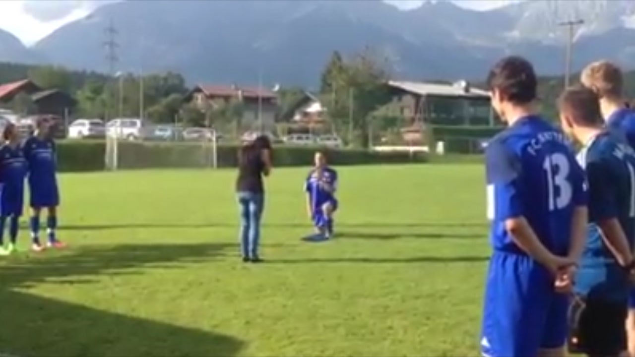Auch Fußballer können romantisch sein wie dieser Antrag auf dem Feld beweist.