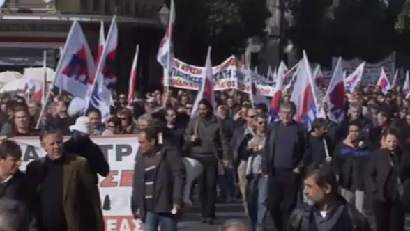 Arbeiter und Angestellete gehen aus Protest wegen Massenentlassungen Lohnkürzungen auf die Straße.