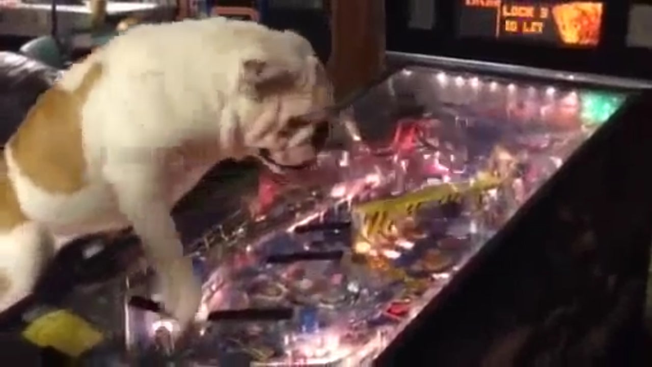 Eine Bulldogge ist völlig außer sich vor Freude über den blinkenden Flipperautomaten.