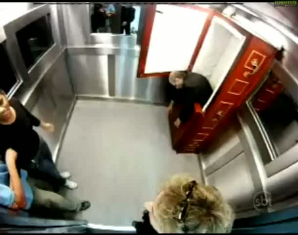 In Brasilien geht der Horror mit der versteckten Kamera im Aufzug weiter: dieses Mal fällt eine Leiche aus einem Sarg und erschreckt die ahnungslosen Liftfahrer zu Tode.