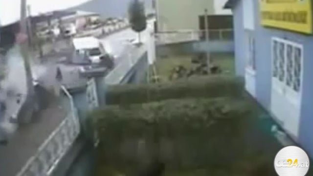 Ein Auto rast mit hoher Geschwindigkeit ins Bild und direkt gegen eine Straßenlaterne. Das Auto wird wortwörtlich in zwei Hälften gerissen. Man kann nicht glauben, dass aus diesen Überresten des PKW jemand lebendig aussteigt.