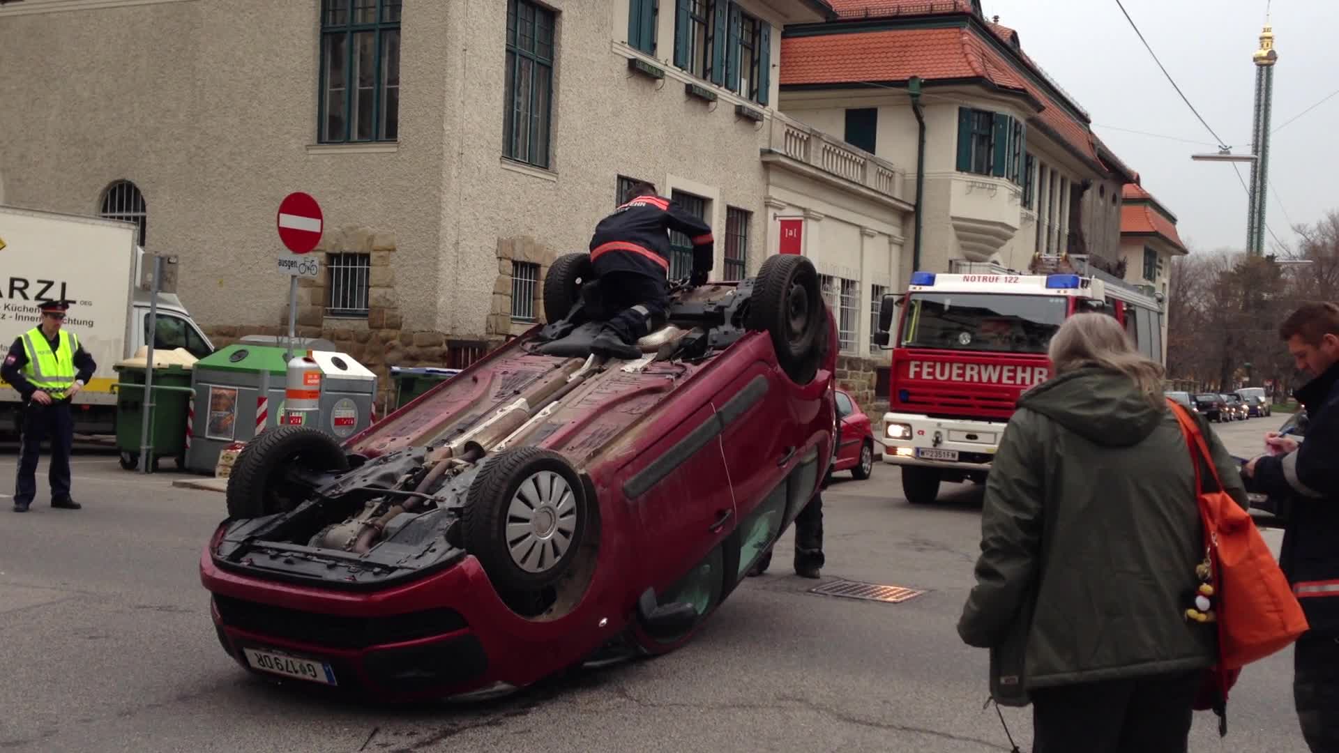 Crash in Wien-Leopoldstadt: In der Kurzbauergasse missachtete ein Auto die Vorfahrt. Dann krachte es mit einem Taxi an der Ecke Böcklinstraße zusammen. Der Aufprall war so heftig, dass das Auto auf dem Dach landete.