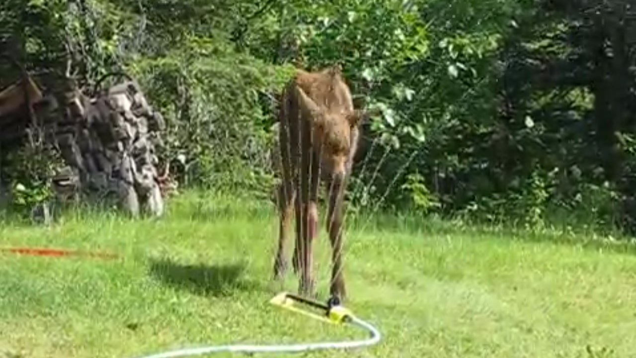 Süß: ein Baby-Elch ist durstig und findet in einem amerikanischen Vorgarten einen Wasser-Sprenkler.