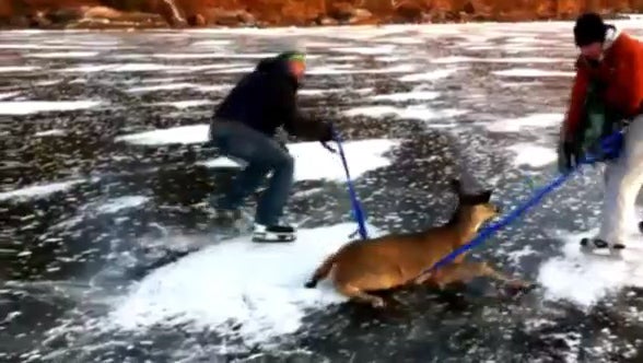 Dieses Reh ist auf dem zugefrorenen See ausgerutscht und schafft es allein nicht mehr auf die Beine. Und so eilen zwei Retter auf Schlittschuhen herbei, um dem "Bambi" zu helfen.