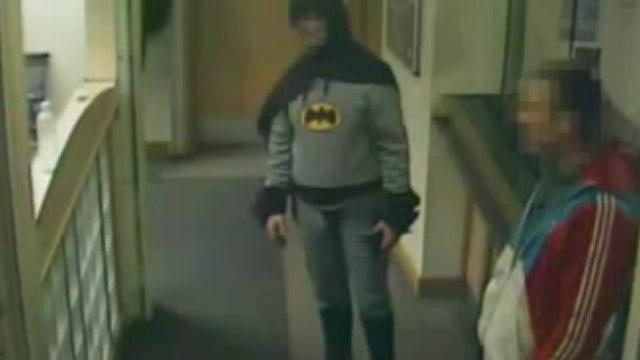 Er trägt einen grauen Ganzkörperanzug. Die Kapuze ist tief ins Gesicht gezogen. Er steht auf dem Gang der Polizeistation in Bradford und der junge Mann neben ihm ist ein gesuchter Krimineller - und Batman hat ihn festgenommen und zur Polizei gebracht.