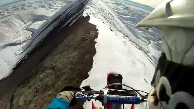Ein Motocross-Bike rast über den schneebedeckten schmalen Grat eines Bergrückens. Links und rechts der Abgrund, ein Sturz wäre vermutlich tödlich.Da, wo andere nicht einmal zu Fuß gehen würden, fährt der Biker als ob er nie etwas anderes gemacht hätte.