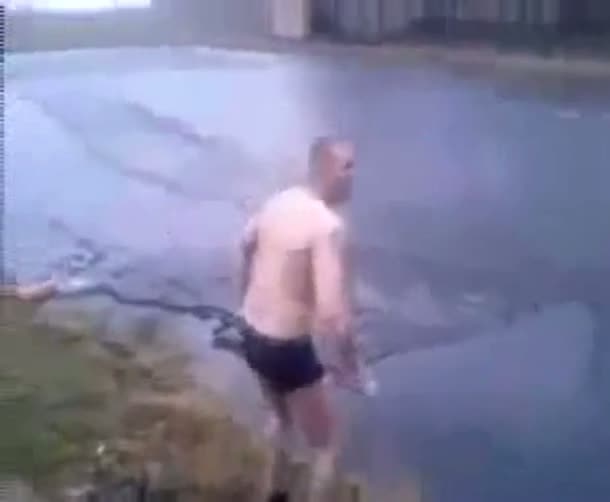 Irrer, total betrunkener Russe springt kopfüber in vereisten See