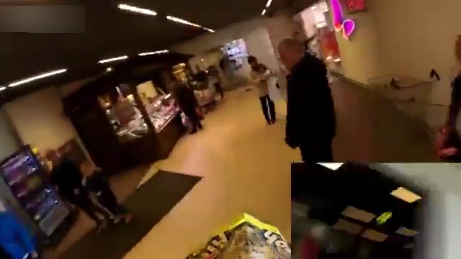 Ein verrückter Motorradfahrer rast durch ein Einkaufszentrum in Polen.