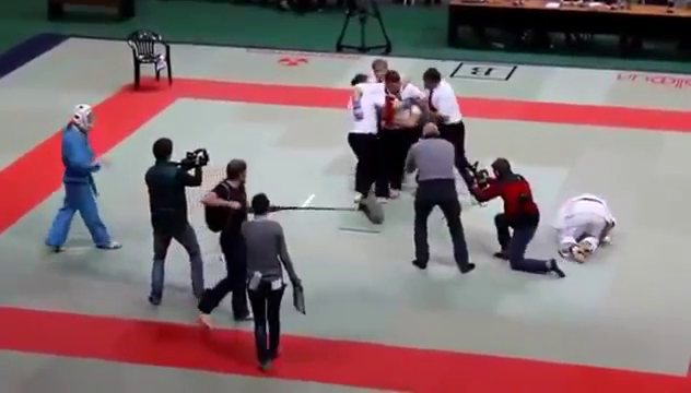Keine Gnade mit den Kontrahenten zeigt dieser Schiedsrichter bei einem Karate-Wettkampf.