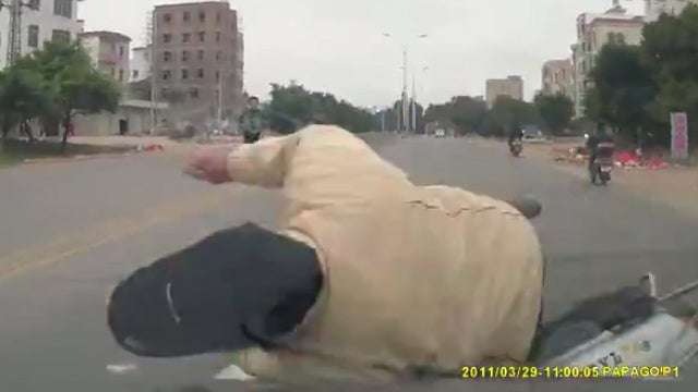 Folgende Szene könnte auch aus einem Actionfilm stammen. Nur ist dieser Mopedfahrer leider kein Stuntman. Mit voller Wucht wird er von einem PKW gerammt und auf die Straße geschleudert. Der Mann steht vorerst gleich wieder auf, bemerkt aber dann erst, dass er schwer verletzt zu sein scheint und muss sich sofort wieder niedersetzen.
