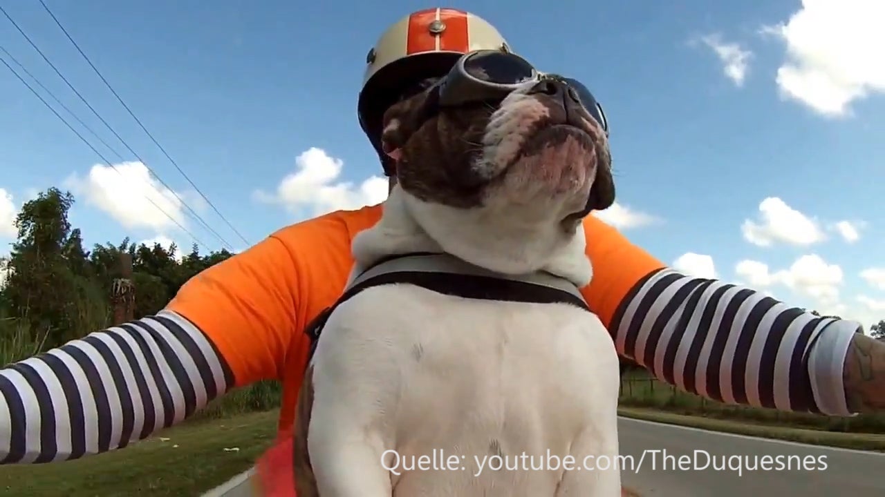 Bei einer gemütlichen Motorrad-Fahrt winkt diese englische Bulldogge zurück.