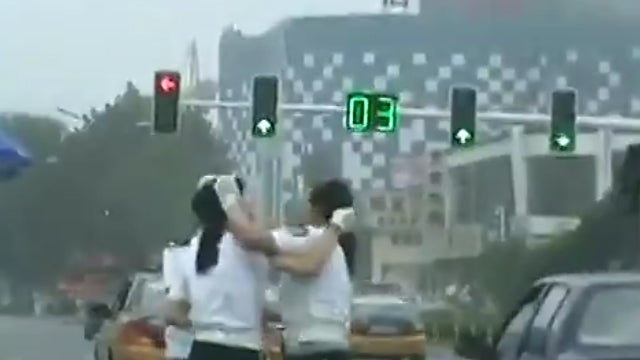 Eine ungewöhnliche Szenerie ergab sich in Tangshen (China). Mitten auf einer Kreuzung kämpfen zwei Verkehrspolizistinnen miteineander. Erst als zwei Kollegen dazwischen gehen lassen sie voneinander ab.