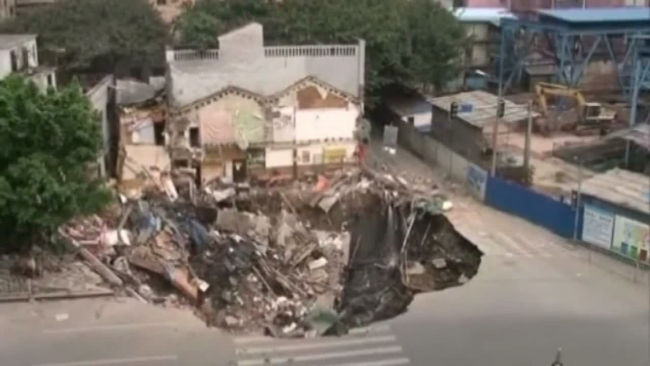 In der südchinesischen Stadt Guangzhou ereignete sich am Montag in spektakulärer Zwischenfall. Vor den Augen von Passanten stürzten entlang einer belebten Straße plötzlich zwei mehrstöckige Häuser ein und versanken im Erdboden.