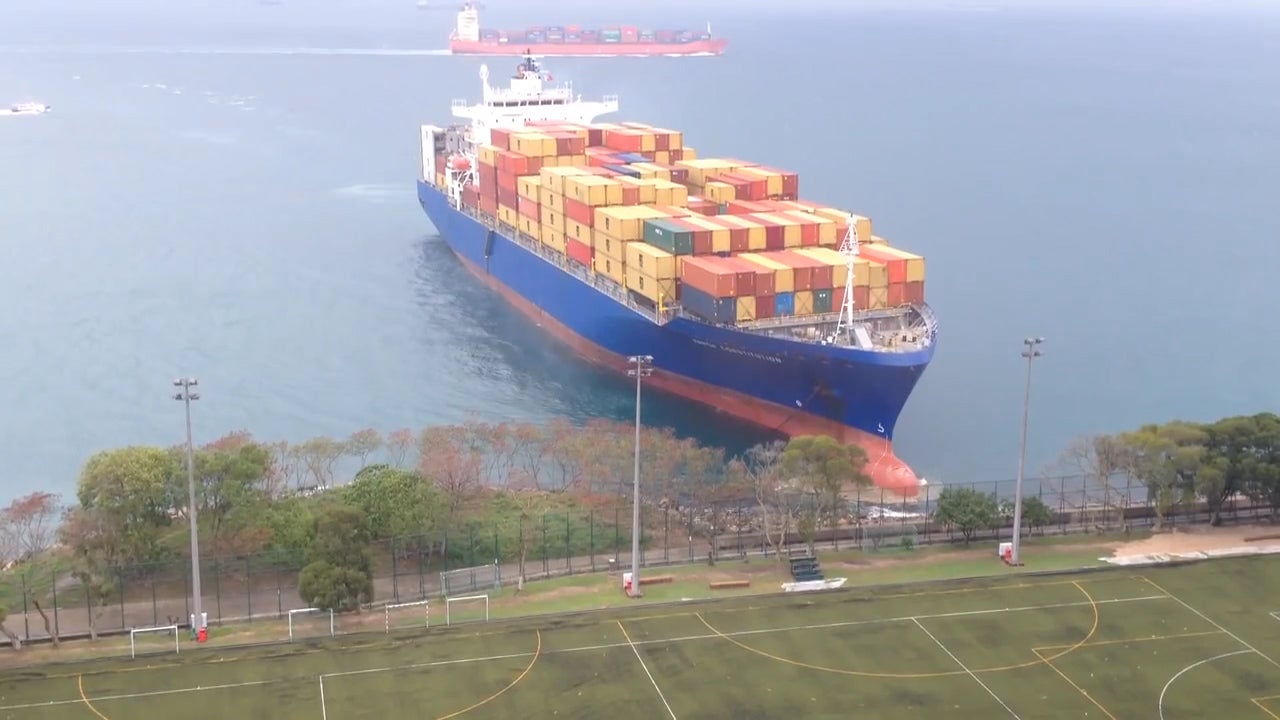 Ein riesiges Containerschiff steuert auf ein Footballfeld zu und fährt beinahe hinein.